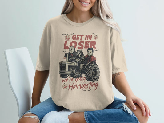Funny Halloween Tractor T-Shirt – Horror Movie Slasher Parody, Spooky Harvest Tee, Fall Fright Night Shirt for Fans