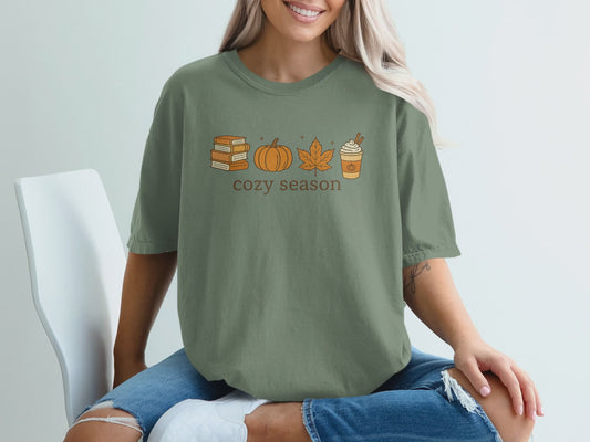 Cozy Season Fall T-Shirt | Pumpkin Maple Leaf Latte Shirt | Book Lover Autumn Tee | Comfort Colors Unisex Fall Graphic Tee